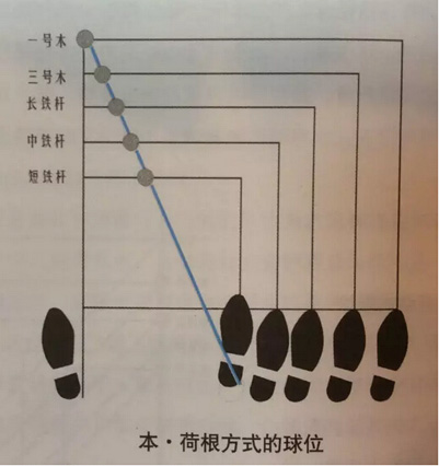 本-荷根式球位是根据球杆的不同,以双脚中央为基准向左右略微调整来确定球位的方法,但一定要保持相同的挥杆动作。根据杆身的长短及杆面倾角的不同,击打出不同的距离和弹道。也就是说,球杆越短,球位越靠右。因为短杆的杆面倾角较大且构造不同,若想以向下的角度击球,球位就必须靠右。
