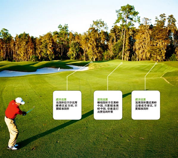 要利用挖起杆攻果岭击球降低杆数,你需要选择合适的目标,正确判断应在何时积极进攻、何时适当保守。如果洞杯位于障碍区后方,就不要直攻球洞。绝对不要。如果你选择直攻球洞,你必须打出完美的击球,而实际上你原本可以有其他选择的。在这种情况下,你的杆数更有可能上升一两杆,而不是降低。如果洞杯靠近存球区(果岭上低洼的部分)、果岭前缘或侧缘等危险区域,也不要直攻球洞。事实上,我的建议是:每次面对挖起杆攻果岭击球时,都要瞄准果岭中部,或者稍微偏左、偏右,但最多不超过果岭左半部或右半部的中心。你可以在一轮比赛中尝试一下这种方法。忘掉洞杯位置,每次攻果岭时瞄准果岭中部。我保证你的杆数会下降。