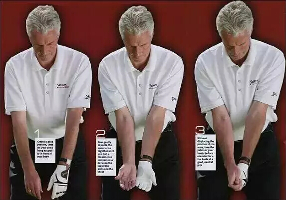 站在镜子前进行这项3步练习,以便创造重要的“控制区”。建立并保持“长三角”是自然挥杆的第一步。熟悉本·霍根的人一定知道这项练习的意义所在。霍根本人也许是在解释双臂及手肘关系方面最伟大的天才。他曾想象将自己的前臂束在一起,来提醒自己手肘朝向臀部、并在挥杆过程中保持这一姿势的重要性。