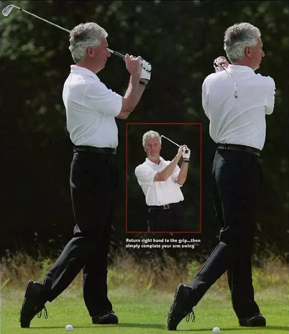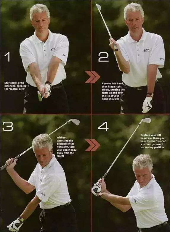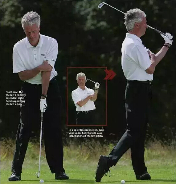 首先仅用左手握杆,用右手将左肘托在身前,保持“联通”。面朝目标站立,在胸前弯曲左肘,将球杆挥至左侧肩胛骨处。用右手托住左臂能够保证在左臂旋转的过程中,左肘仍然朝向左侧臀部,这点十分重要。当你再次用右手握杆并完成身体的旋转时,你会发现自己自然而然地复制了上杆动作,不仅没有失去平衡,而且直上直下的动作将背部压力将至最小。