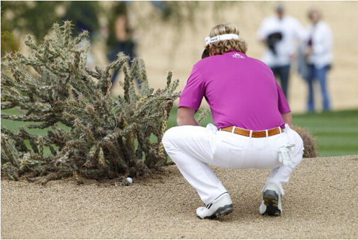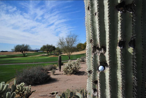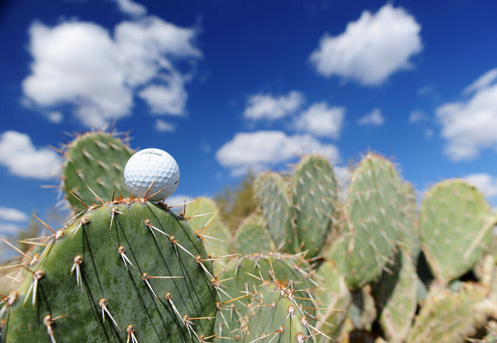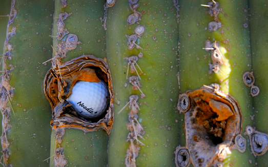 高尔夫球是一项迷人的运动,奇妙的高尔夫球让你忍俊不止。小白球落入到沙坑边缘、树杈上、水边、甚至球迷的大腿上,给球员造成困难。但有时候球场的仙人掌却感到很“郁闷”,不断被高尔夫球击中。