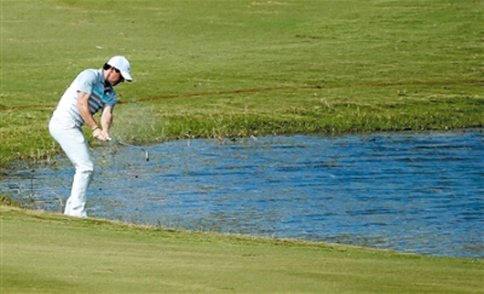 在伤愈复出后,罗里·麦克罗伊首战2015PGA锦标赛。在首轮战罢,小麦打出71杆(-1),第5洞是长度为589码的五杆洞,小麦第3杆进攻果岭的击球落入果岭左侧水中。好在球还有一半露在水面外,小麦没有选择抛球,而是卷起裤脚,穿鞋踏入水中,向旗杆进攻。厉害的是,小麦保帕成功!