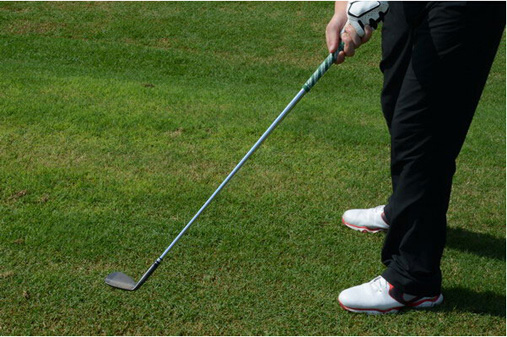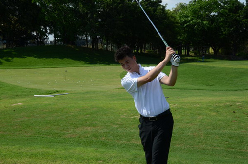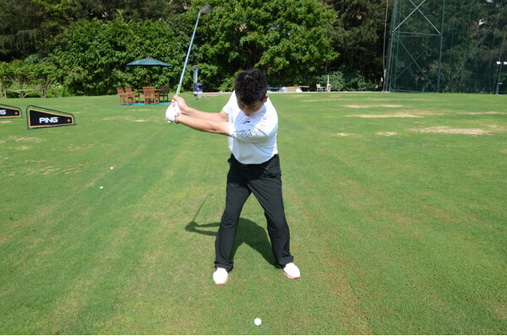 图4:右臂紧贴胸口,因为同样30码距离采用高抛打法时我们需要比常规30码打法更大的挥杆幅度,这时候的右手臂分离身体很容易造成杆头提前接触地面,造成打深。