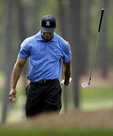 2009大师赛第二轮18洞打出一杆近击球后,伍兹失望的扔掉球杆。