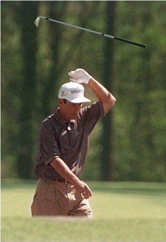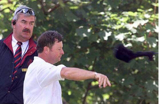 伊恩-伍思南(Ian Woosnam)因球包里球杆多于标准数量遭罚心情不佳,撇出一支三号木。