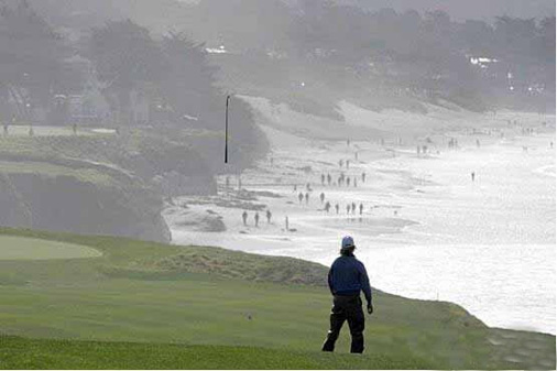 查理-霍夫曼(Charley Hoffman)2009年在风光旖旎的圆石滩抛向空中。