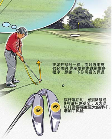 在开球和攻果岭时,你都会贯彻击球前准备程序,对吗?短打也不应例外。想象一下你需要的弹道,球在果岭的什么地方着陆,着陆后如何滚动。然后选择能够制造出这种击球的球杆。你并不一定要使用沙坑杆。如果旗杆位于果岭后部,有足够大的空间可供球着陆,你可以使用杆面倾角较小的球杆(比如8、9号铁杆),使球飞得低一点儿。这种打法更安全。沙坑杆需要更大的挥杆幅度,这加大了出现失误的可能性。