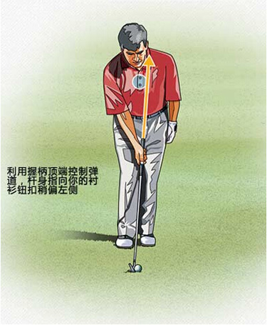 当你试挥了两三次、想象了击球以后,走向球,将杆面置于球后方。接下来,面对标准弹道劈起击或切击,应使握柄顶端移至球稍偏前方;面对有效杆面倾角更大的击球、更高的弹道,应使握柄顶端处于球稍偏后方。然后站位,确保杆身指向你的衬衫钮扣或胸骨左边一点儿的地方。这样球与身体的相对位置就是合适的,你将在触球时获得所需的有效杆面倾角。