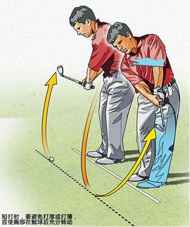 短打时,你需要使球杆保持在身体前方,避免球杆向着目标方向线内侧或外侧太远的地方移动。这样你更有可能做出稳固击球,使球沿着正确路线开始飞行。下杆时,在重心移向前腿的同时,让球杆向着你的身体前方挥动。使胸部保持向着目标转动,就像你的身体和杆身是一个整体一样,这一点至关重要。如果你的躯干中止了动作,停止转动,杆头就会过早达到挥杆弧最低点。结果是什么?打厚或打薄。博基离你不远了。