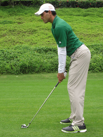 下巴抬高,维持于胸口的距离。双手自然下垂握住球杆,由于右手位于左手下方,所以右肩自然会比左肩低,一般低一个拳头左右。但右肩不能向前,如果向前就会使身体向左倾斜,破坏平行瞄球及身体平衡,无法做出优美的挥杆动作。