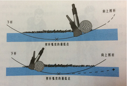 为了增大击球的力量,击球瞬间,左臂与杆身应该成一条直线。同时,要尽量增加挥杆弧度,击球瞬间应在挥杆弧度的最低点。