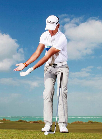 所需的感觉就是身体以一个整体运动,一切都是联系在一起的。双手靠拢,掌心向上,做挥杆动作,在下半身稳定的前提下上半身尽量转体。