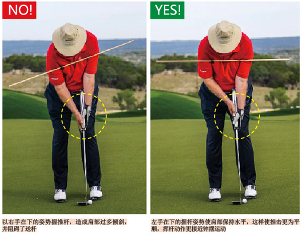 几乎所有高尔夫球手握推杆时都是右手在左手的下面。这是很自然的动作,大部分原因是由于你就是这样握铁杆和木杆的。但有的人以右手在下的方式握推杆却会导致失误。