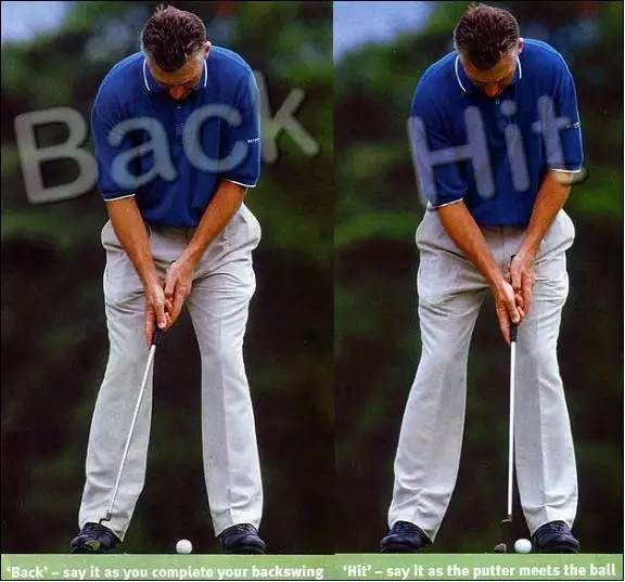 “上——打”练习相当简单。在这项游戏中,你不再关注将球推入球洞的任务,而是集中注意在做相应动作时对自己说“上”及“打”即可。当我感到压力重重时,就会在上杆的同时喊出“上”,在杆头碰到球的刹那喊出“打”。有时候我会在脑海中说这两个字,有时候则会大声喊出来。
