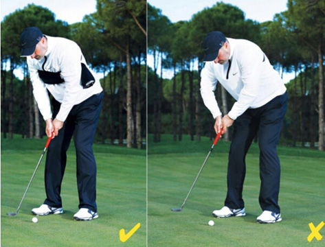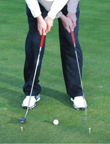 当面对长距离推球时,很多球员的上杆和送杆动作不均衡,这直接导致对推球距离的控制不足。因此保证在推杆过程中相同的上杆和送杆距离至关重要,这可以帮助你理解在面对不同的推杆距离时所需要的上杆幅度。在训练过程中,在球的前面和后面的相同距离分别放置一个球座。注意用球座检测球在上杆和前送过程中是否达到相同的距离,并体会这种控制感。你会发现球的滚动距离更具有一致性。