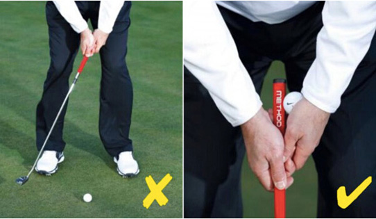 当很多球员在面对长距离推杆时很难保持动作的一致性,这是因为他们的手臂往往跟身体是脱节的,这让他们无法保证每次推杆的动作都是一样的。像上图左边的示范一样,在推杆练习的过程中放一块毛巾夹在手臂和身体之间可以有效改善这一问题。这样做的目的是保证在推杆的过程中双臂都能夹住毛巾而不掉落。你可以立刻感觉到保持手臂与身体连接的效果。