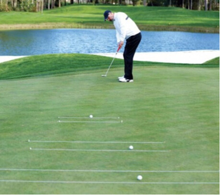 如果想在果岭上拥有很强的距离控制感,需要时刻测量以及管理你的训练效果。从图中可以看出。在果岭上用球座以及绳子根据推杆距离划分出长、中、短3个不同的区域,推球时把球推到每个不同的区域中,这可以给你快速的反馈让你了解的击球力量太大还是太小。