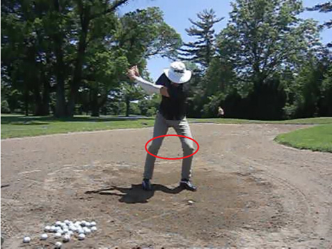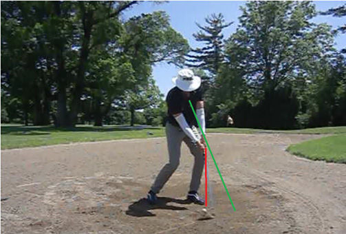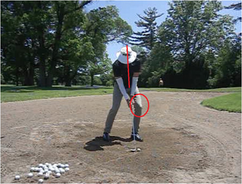 如图所示,球员的双脚站位开放宽敞,双膝弯曲。其重心落于左膝处(红圈所示)。尽管他将身体重心偏向左侧,但躯干仍然呈垂直状态(红线所示)。见过不少业余球手双脚站位相当狭窄,重心在双脚分布均匀,或甚至将重心落于右脚。这会导致击球角过浅,容易击中杆头前缘。