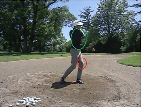 最后球手的全转身标志着完美的收杆。在他的胸膛朝向目标左侧的同时,下半身仍对准目标,或在目标的右侧。注意其左膝,仍然呈弯曲状态,这再一次证明了下半身在整个挥杆过程中是多么的稳定。这样完美的挥杆,才能产生足够大的速度和后旋使得球离开沙坑。
