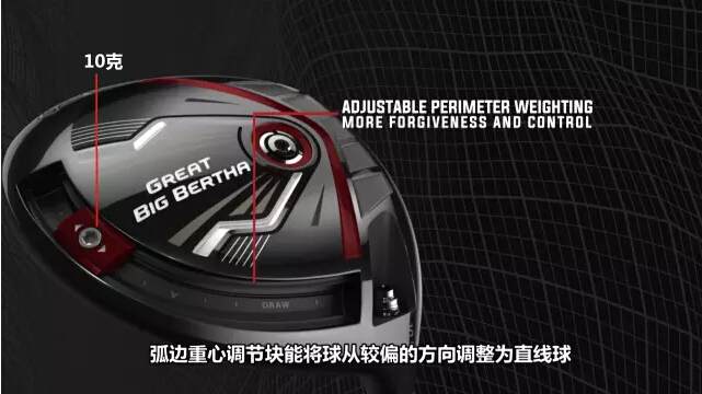 新一代Great Big Bertha 发球木的最大改进之处就是配置在杆头边缘的重约10克的APW弧边重心调节,这是卡拉威史上最简单但也最前沿的一款调节设计。
