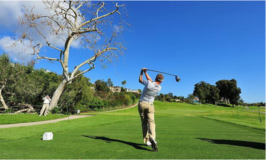 一记完美的开球会令球停上球道,而且停在比你的双脚位置更高的地方(如果你是右撇子的话)。在这个容易打出钩子球的球位上,你还得用中长铁杆来攻向令人极易产生错觉假象的果岭,而果岭的左侧有着几乎致命的沙坑。