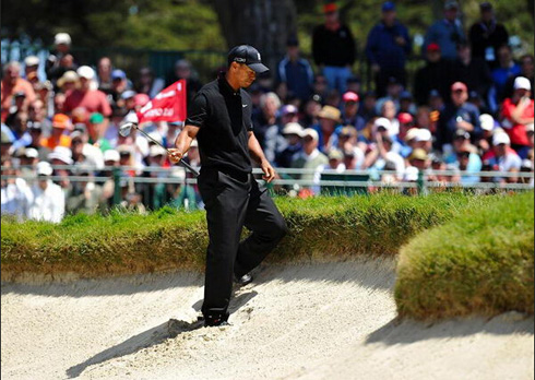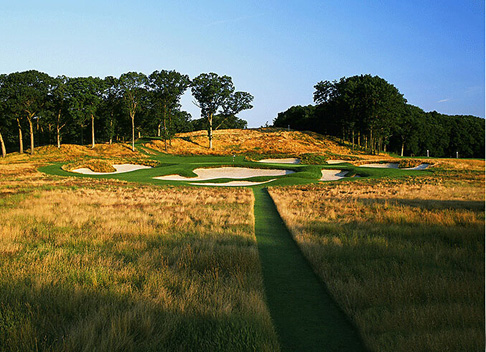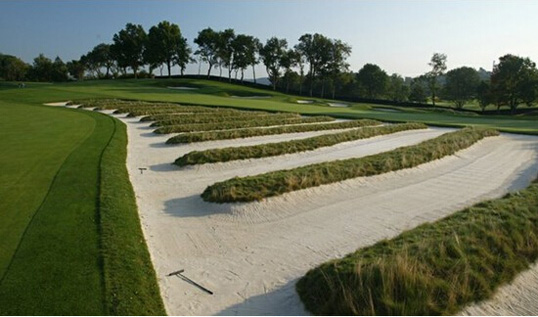 整个这座球场里只有一个球道沙坑,但却是非常显眼,而且在2012年的美国公开赛上更是显得举足轻重。一旦球掉进了这里,那你就得摒弃所有一杆攻上果岭的希望。如果你的开球落在这个沙坑后面而没有掉进去,那你面对那旋转椅般的果岭的距离又增加了200码。