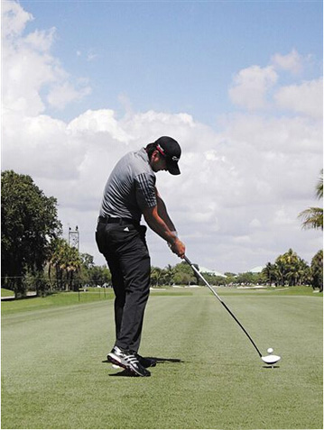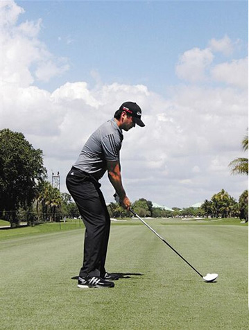 戴伊的左脚略微打开,双膝微曲,双髋和双肩和目标线平行。他采用的是偏弱势的握杆方式,因为在释放击球时他的手腕显著转动。他的下腹部正对球,较宽的站位有助于控制髋部的转动,这一预备姿势预示了强有力的击球释放。