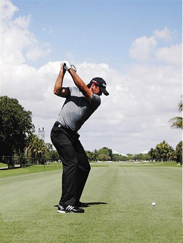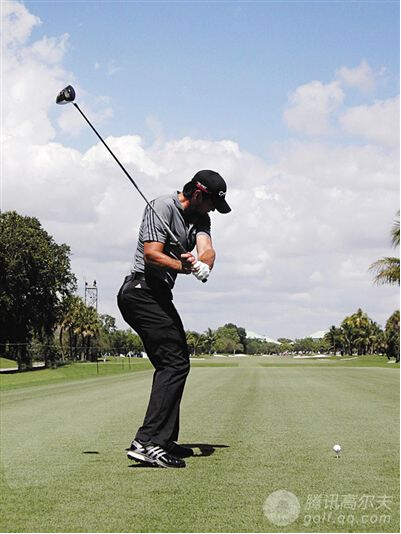 启动上杆时,双肩、双髋和身体核心一起转动。他的双腿和双膝转动幅度较小,由于腿部的限制,他的上半身和头部略微横移,上杆路径更加陡直(神经系统介入的表现)。这种上杆蓄积了强大的挥杆力量,但会影响稳定性。