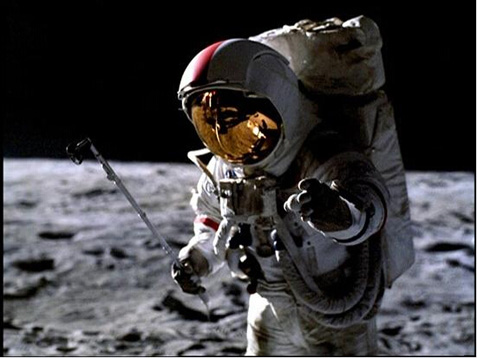 谢泼德:“休斯敦,我想你能认出我手上拿着什么,右手是一支的6号铁杆,在我左手,有一个千百万美国人都认识的小白球。现在我要把它丢到地上。不好意思,这航天服太硬了,我没法用两只手挥杆。”