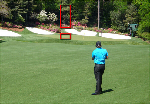 在上图中,菲尔-米克尔森的目标可能是果岭后侧那颗白色的小树(红框中)。这个具体的目标当然和整个果岭或果岭的一部分有很大的区别。当你下次击球时,记得把目标具体化作为击球前的常规准备,你会发现效果大不相同。