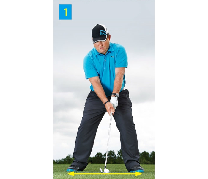 加大双脚间距,以这样的宽站位练习铁杆击球。采用宽站位自然会限制上杆幅度。你可能会感觉这样很别扭,但只要坚持打完一筐球,你的挥杆质量就会大有提高。具体做法见下面的3个步骤。