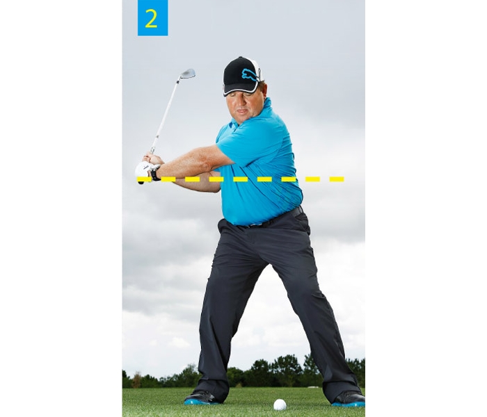 上杆,当双手与腹部同高时停止。由于宽站位会限制上杆幅度,你很难加大上杆幅度。
