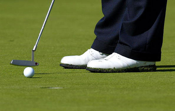 ·在练习果岭上,两位球员选择在距离球洞9~30英尺之间的地方推球,进行“9洞比洞赛”。