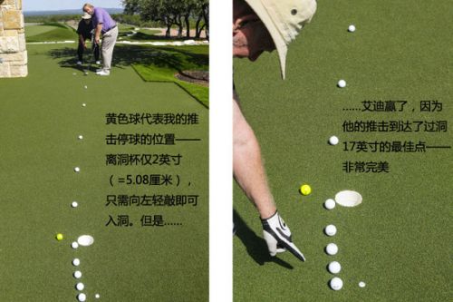 上图中,我正在进行“过洞17英寸”的竞赛,对手是我儿子艾迪。就像左图中展示的那样,我推了一个20码的长推;图中黄色球的位置是我的推击停球的位置——洞杯右侧几英寸处。还不错。但艾迪的球擦着洞杯右沿滚了过去,轨迹略向左转直到停球,因此,他赢了这洞。为什么?尽管我的球离洞杯更近,但他的推击速度更好,并有机会进洞,而且还离过洞17英寸的最佳点最近。