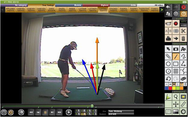 图中的两个常量分别是橙色箭头和蓝色箭头,前者表示目标线方向,后者表示一般球手的由 内向外的挥杆路径。而红、绿、黑箭头则表示在蓝色的挥杆路径下的不同的击球杆面朝向。