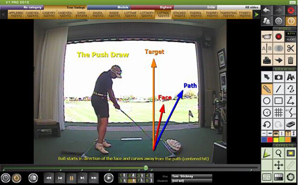 在这种自左向右的模式中,最重要的一点是,杆面在击球时要保持闭合,这样球在初始飞行 弹道才会在目标线的左侧。才能形成理想的先左后右的PULL FADE弹道。所以说,导致致 命的右曲球路并不是大多数人认为的挥杆轨迹,而是与击球时的杆面朝向有关。