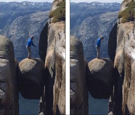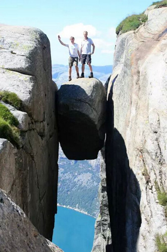 豪克森表演的地方是挪威著名的谢拉格伯顿石,又名奇迹石,是拍摄大胆照片以及极限跳伞的胜地。