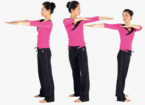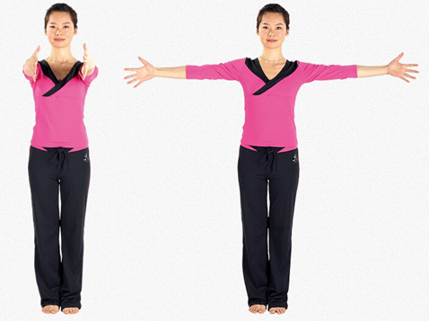 双腿并拢站立。吸气,双臂侧平举,掌心向前,保持脊柱延展;呼气,两个手掌体前重合;吸气,双臂侧平举,掌心向下,保持脊柱延展;呼气,下落靠近大腿但是不贴上去。重复10次。