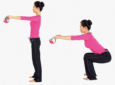 站立,双腿打开与髋部同宽,尽量让脚内侧平行。吸气,双手向正前方伸出,掌心向上握住球杆;呼气,屈膝下蹲;吸气,腿部慢慢站立起来,手部动作保持不变。重复10次左右。