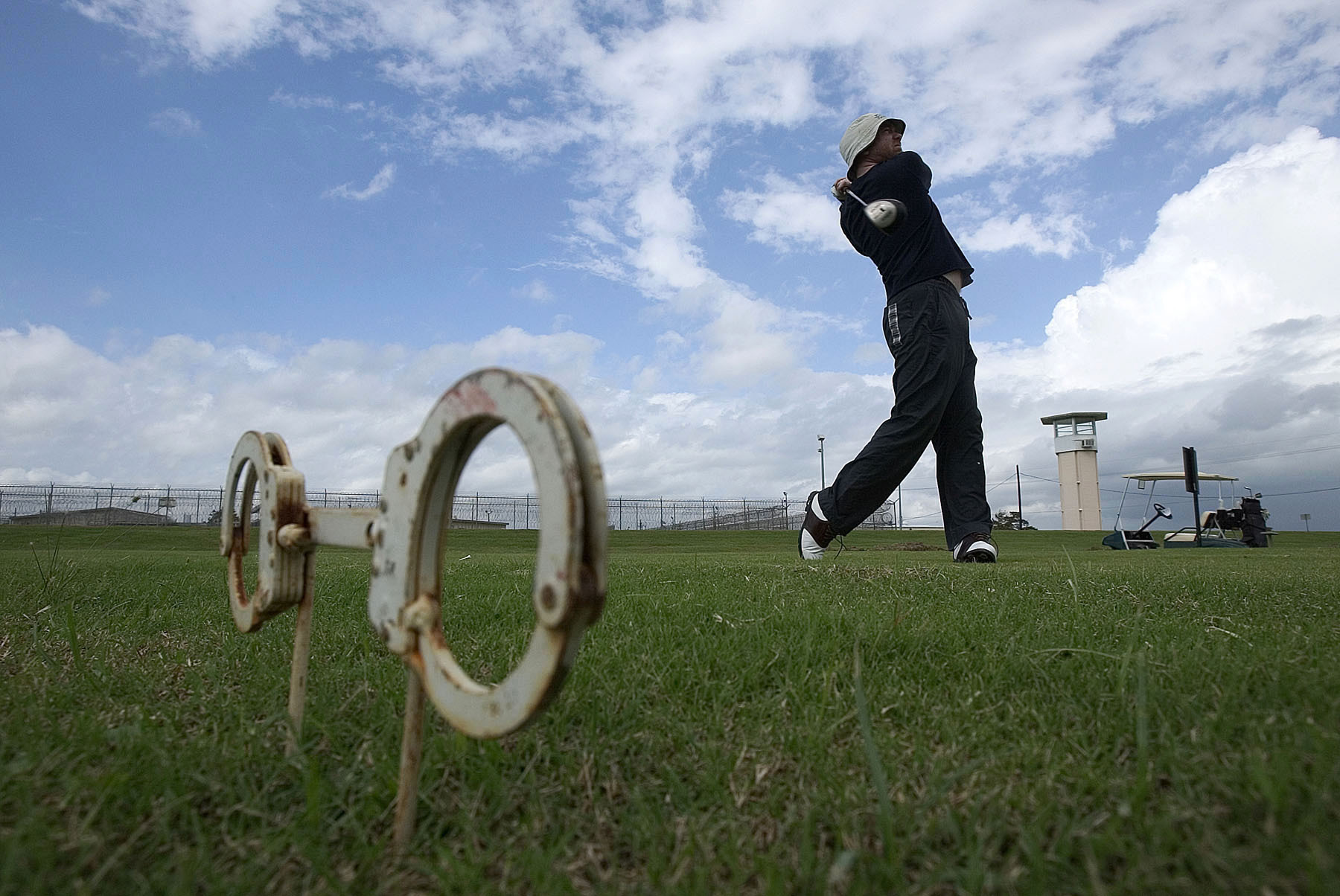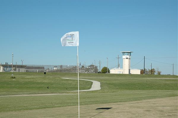 这个球场对公众开放,不过要在48小时前提交申请。打球之前必须提交背景资料。除了家庭住址还要提交出生年月日,驾驶执照,社会保险号码等资料等待审批。访问了关在监狱的犯人是不能申请。9个球洞各自设Out 和In的发球台,加起来就是标准杆72杆,6,000码的球场了。不过也接受访客打球。果岭费10美元,注意事项上明明写着:“Absolutely NO firearms, drugs, alcohol or other contraband items (such as, but not limited to, cameras,knives, etc.) are allowed on the premises.”不准携带武器、药物、酒精及其它违禁品(例如但不限于相机、刀等)。从谷哥地图上看有4幢收容所和宽阔的球道。起码这是在其它任何国家看不到的光景。