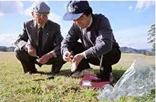 大村智(左)和同事在高尔夫球场收集土壤样本