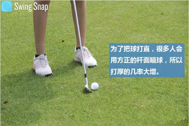以方正杆面瞄球,不但无法利用反弹角,还因为杆面前缘会先触碰地面,所以容易打厚。