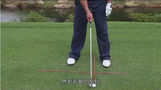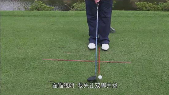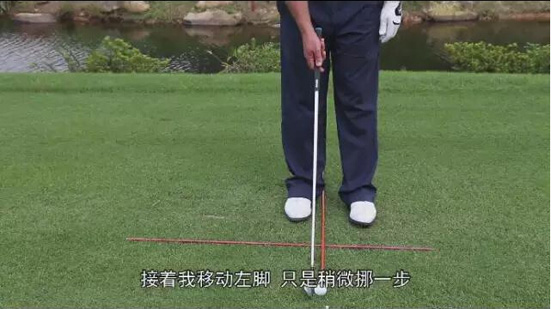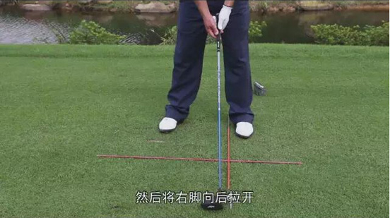 2、一号木的理想球位是:球正对着左脚后跟,所以左脚几乎不用移动,将右脚拉开,因为它长一些,杆面倾角最小,需要这样的球位以让球稳定地飞起来。