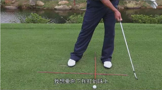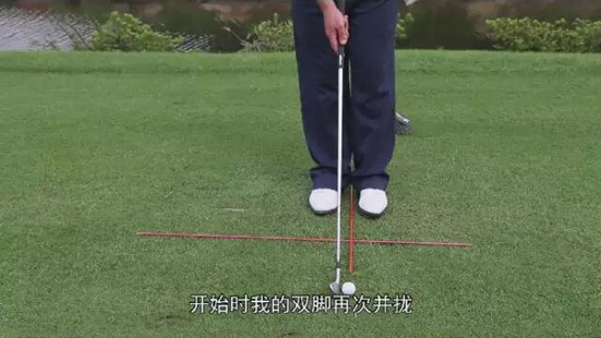 因为9号铁短一点,需要站得再靠后一点击球,但球绝对不能超过站位中线的位置。因此使用9号铁时球位居中。