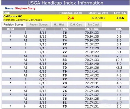 当天,库里打了76杆,对于差点2.4的库里来说,这是正常的成绩。