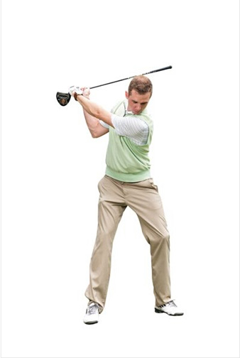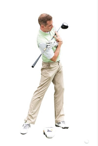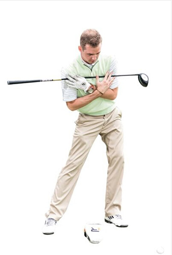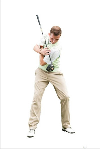 双脚开立,比肩稍宽,双膝微屈。双手在胸前十字交叉,横抱球杆。向右转肩,直到最大角度,坚持数秒。杆套放在脚下,作为衡量左肩是否摆动到位的参照物。