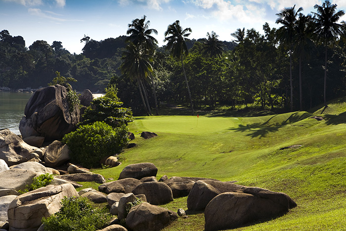 印尼民丹岛的乐古浪球场(Laguna Bintan)是大白鲨诺曼在东南亚的又一力作。Laguna也被译作礁湖,但依托风景迷人的热带岛屿景观,“乐在浪边”似乎更符合它的写照。占地60公顷,场地地形多样,森林、湿地、海滩交错,甚至还有一座废弃的采石场。在徐徐微风下你可以尽情享受海岸温柔,比如在南中国海包围的7号洞和8号洞;而废弃采石场的大石自然横陈又为你的海岛挥杆增添了一些粗犷美。说这个度假型球场乐趣与挑战并存,一点不差。