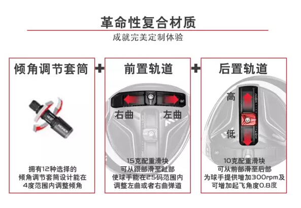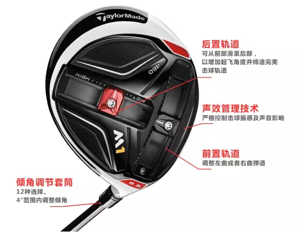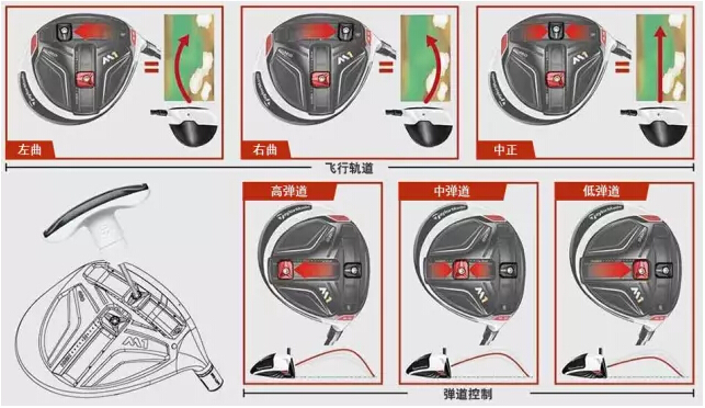 M1发球杆前置轨道处配备的15克配重滑块,可从跟部滑至趾部,使球手能在25码范围内调整左曲或者右曲弹道。不仅如此,后置轨道处配备的10克配重滑块,可从前部滑至后部,为球手提供增加300rpm及可增加起飞角度0.8°。