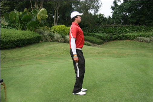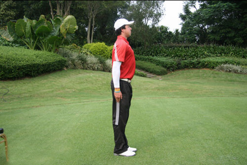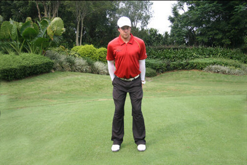 第五步,完美站姿最后一步,双臂自然下垂。如果双手太靠近身体,重心就会过多转移至脚跟;如果双手伸出太远,重心就会过多转移至脚趾。两者都会影响击球瞬间的稳定性。