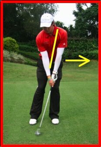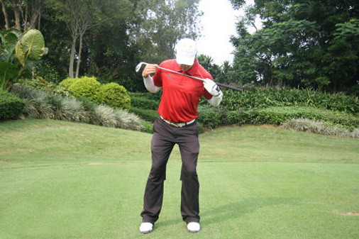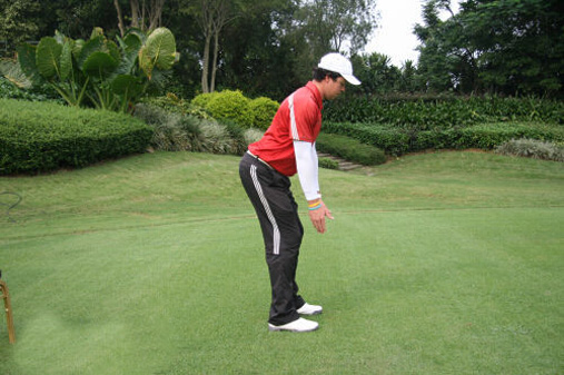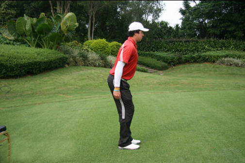 第三步,提臀同时上半身从腰部开始向前倾斜。前三步与全挥杆击球准备完全一样。当你从站直姿势转为提臀姿势,你的上半身会向球的方向倾斜。这样你就形成了一个运动状态并具备更好的平衡。